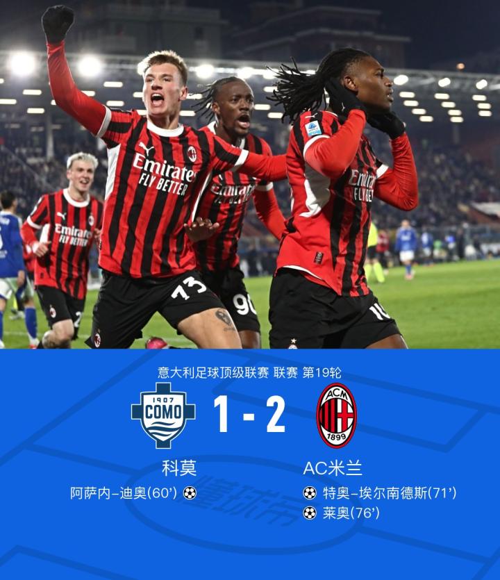 北京时间1月15日,意大利足球顶级联赛第19轮的激烈对决在科莫主场展开,AC米兰客场对阵科莫。比赛上半场即迎来曲折战局,科莫队的普利希奇在比赛中受伤,被迫在中场被换下。下半场比赛更加激烈,迪奥在第60分钟冲入禁区后打近角破门,为科莫首开记录。但AC米兰并未气馁,随后特奥在第71分钟禁区内抽射得手,将比分扳平。突出表现的亚伯拉罕在第77分钟完成直塞,莱奥单刀挑射得手,帮助AC米兰以2-1逆转科莫取得胜利。